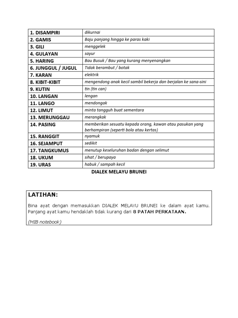 Bina Ayat Dengan Memasukkan Dialek Melayu Brunei Ke Dalam Ayat Kamu Panjang Ayat Kamu Hendaklah Tidak Kurang Dari 8 Patah Perkataan Pdf